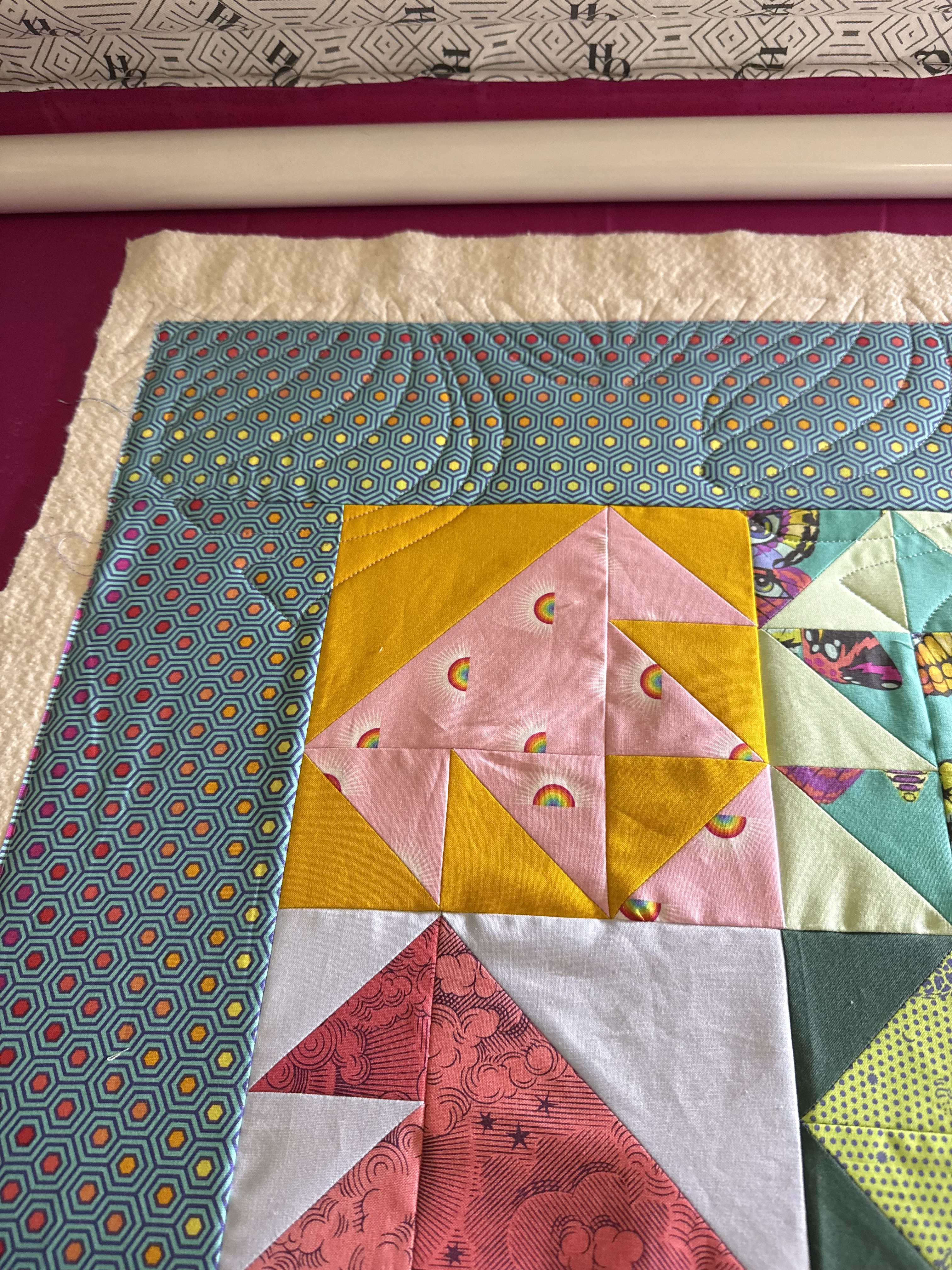 - Prepare your quilt-Prepare your project by ensuring your backing is one piece and 6 inches longer than your quilt top on all sides. Clip any loose threads, remove any hard items (buttons, zippers, etc.,) and be sure your project is squared.